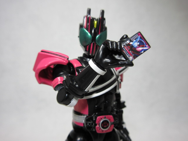 ヤミヒメ「カードを持った手は表と裏の1つずつだが、付属のシールによって『ジオウ』劇中に登場した絵柄を再現できる。今回はせっかくなので、レジェンドとしては最新のビルドを選んでみた」
